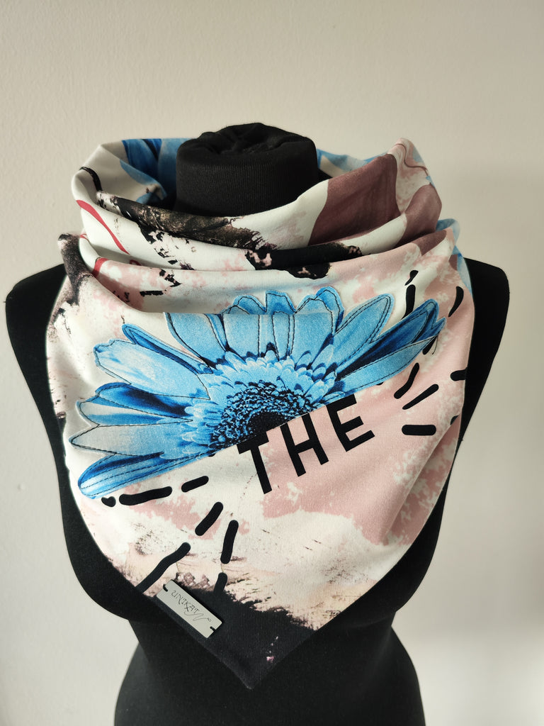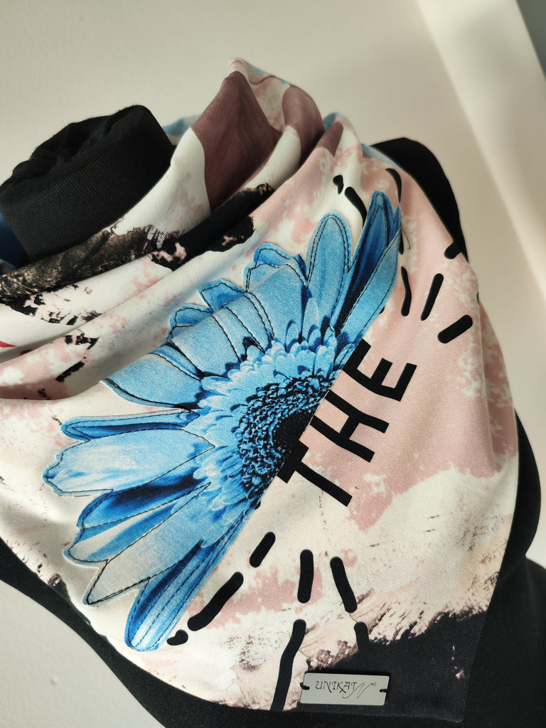 Rutica v cevasti obliki, ki jo preprosto nataknete čez glavo. Rutica ima zgoraj aplikacijo modre rože, ki jo naredi prav posebno in unikatno. Spodaj je enobarvna črna, tako da jo lahko nosite obojestransko.