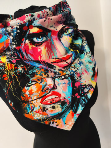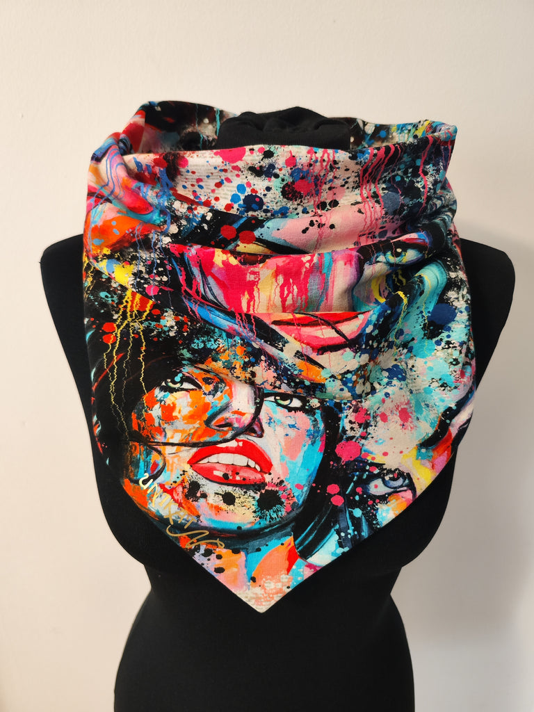Cevasta rutica , ki jo enostavno nataknete čez glavo. Zgornji del je v pisanih barvah z motivom obrazov, spodnji je enobarven črn, tako da jo lahko nosite na obe strani. Vzorček na rutici lahko kombinirate povsod in paše na vsak stil oblačenja.