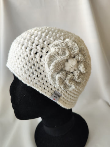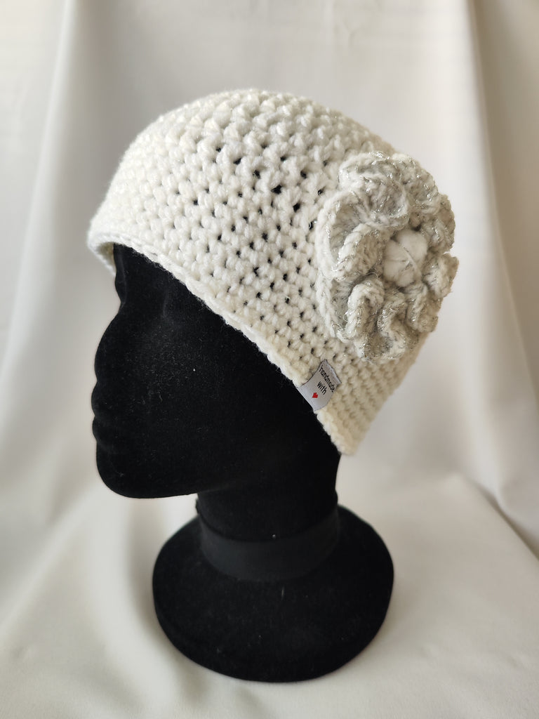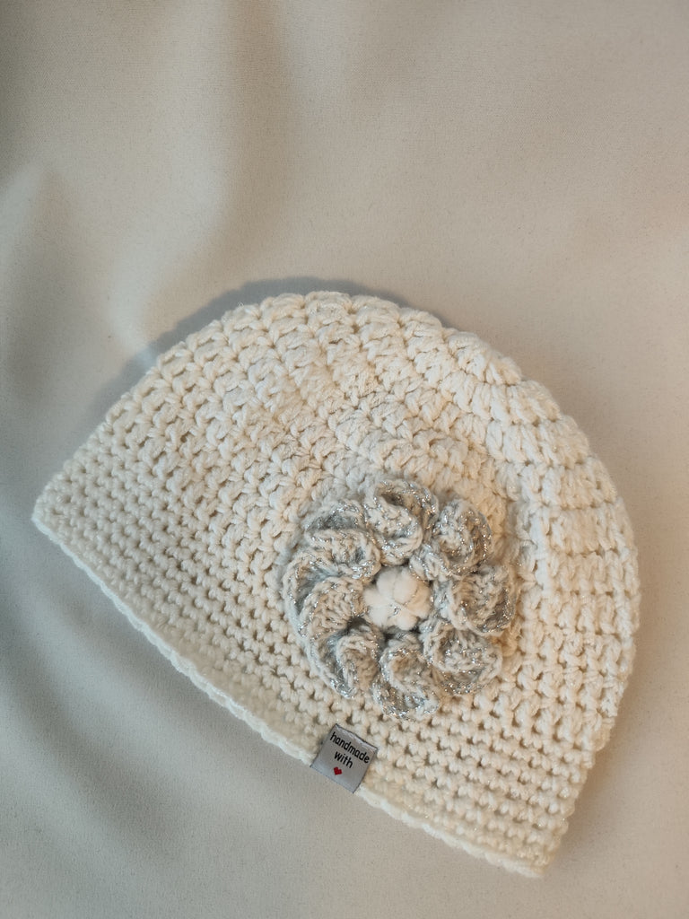 Modna unikatna ročno kvačkana kapa, ki je v toplejših dnevih tudi lep modni dodatek, ker je zaradi redkejšega vzorčka primerna tudi za pomladne dni. Na kapi je prišita kvačkana rožica s srebrno nitko, kar jo naredi posebno in unikatno.
