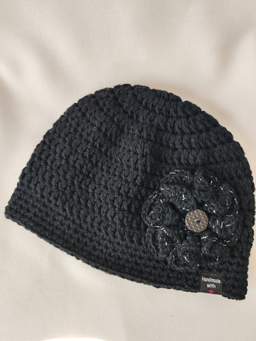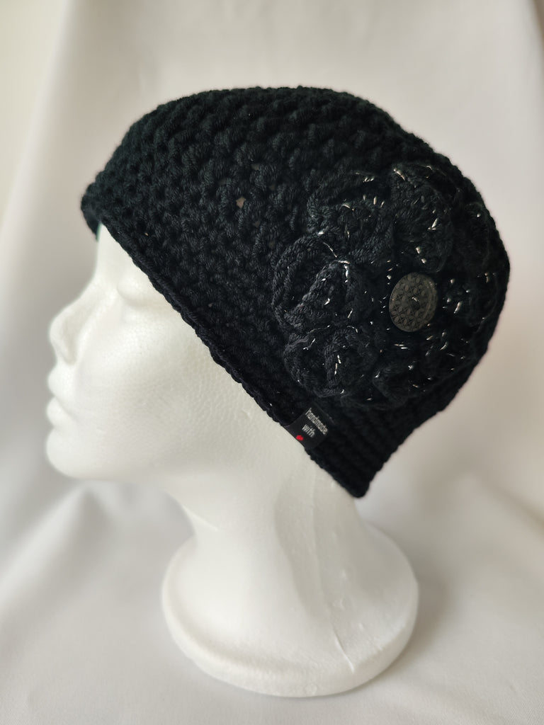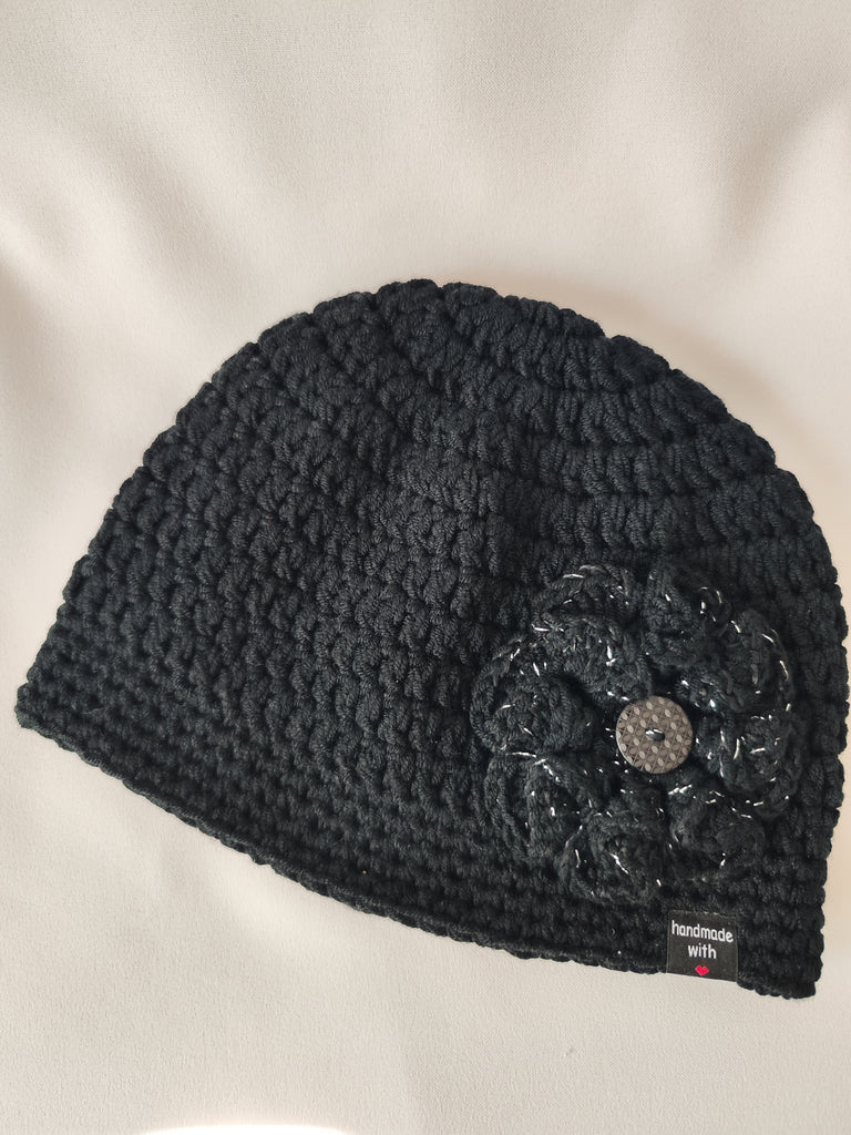 Modna unikatna ročno kvačkana kapa, ki je v toplejših dnevih tudi lep modni dodatek. Kapica je narejena iz debelejše preje in je kompaktna, tako da lepo drži svojo obliko. Na kapi je prišita ročno kvačkana rožica z gumbom v sredini.