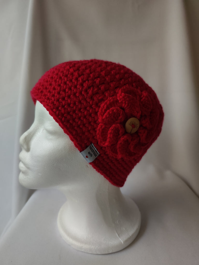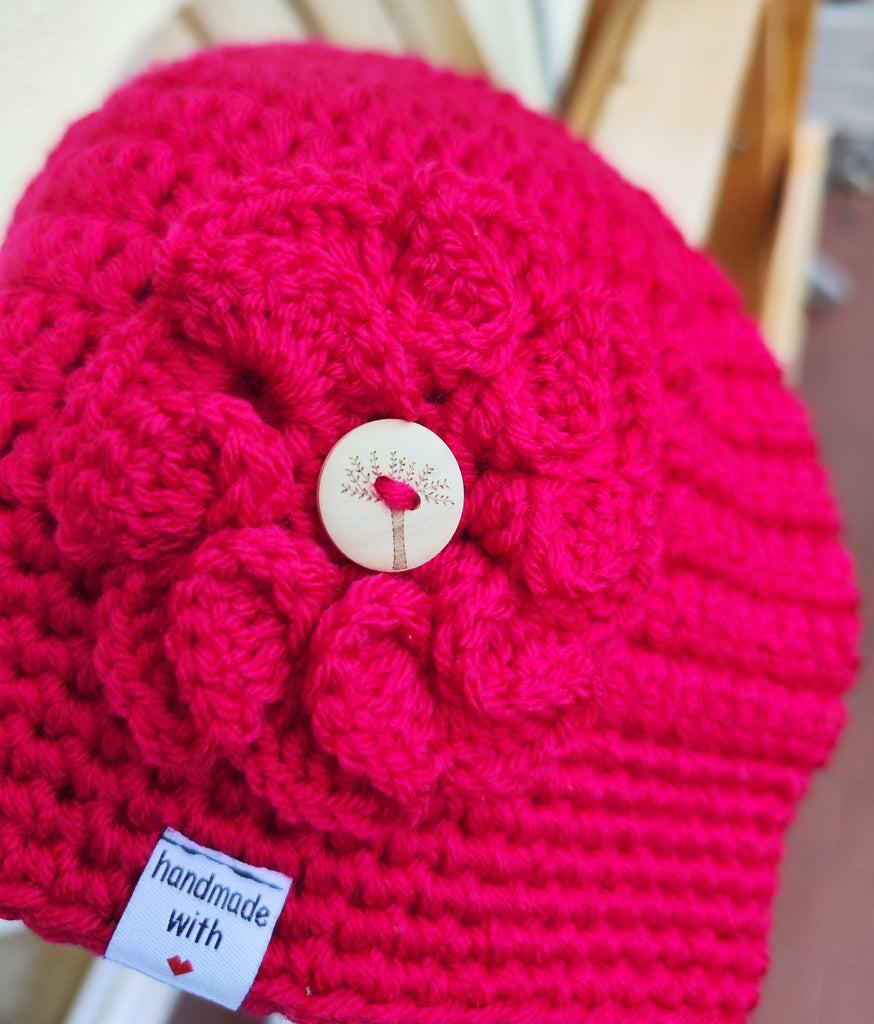 Modna unikatna ročno kvačkana kapa, ki je v toplejših dnevih tudi lep modni dodatek. Kapica je narejena iz debelejše preje in je kompaktna, tako da lepo drži svojo obliko. Na kapi je prišita ročno kvačkana rožica z lesenim gumbom.