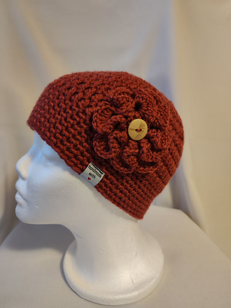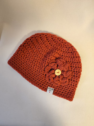 Modna unikatna ročno kvačkana kapa, ki je v toplejših dnevih tudi lep modni dodatek. Kapica je narejena iz debelejše preje in je kompaktna, tako da lepo drži svojo obliko. Na kapi je prišita ročno kvačkana rožica z lesenim gumbom.