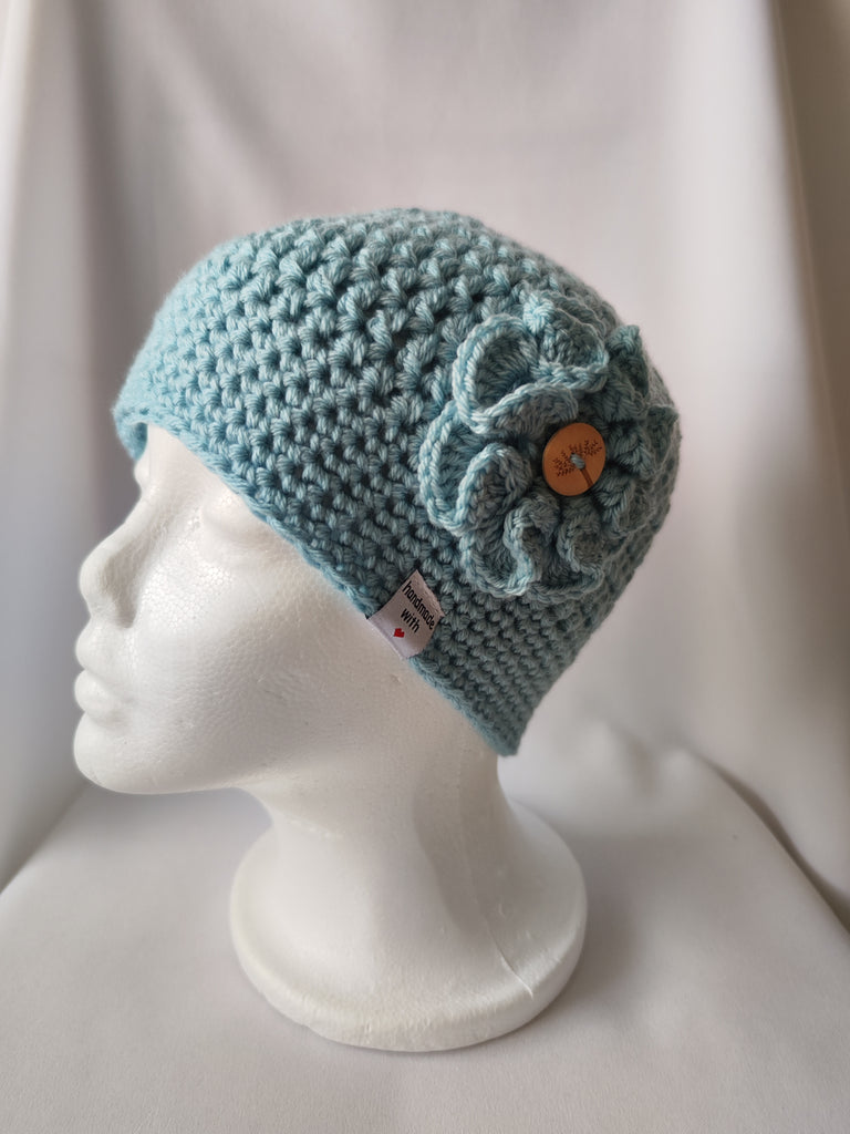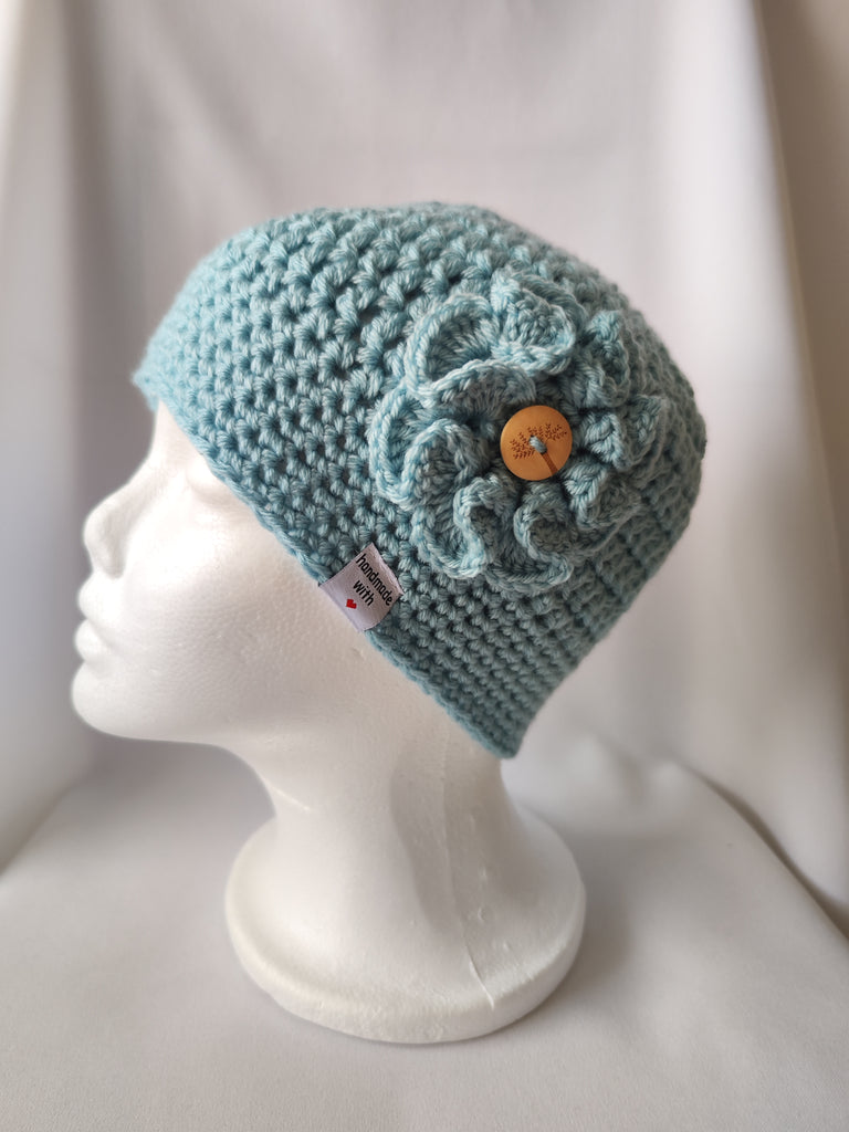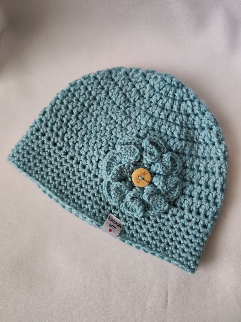 Modna unikatna ročno kvačkana kapa, ki je v toplejših dnevih tudi lep modni dodatek. Kapica je narejena iz debelejše preje in je kompaktna, tako da lepo drži svojo obliko. Na kapi je prišita ročno kvačkana rožica z lesenim gumbom.