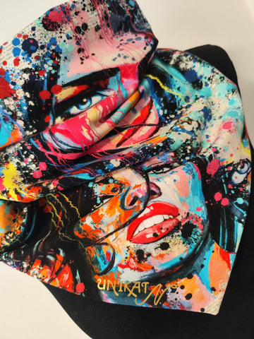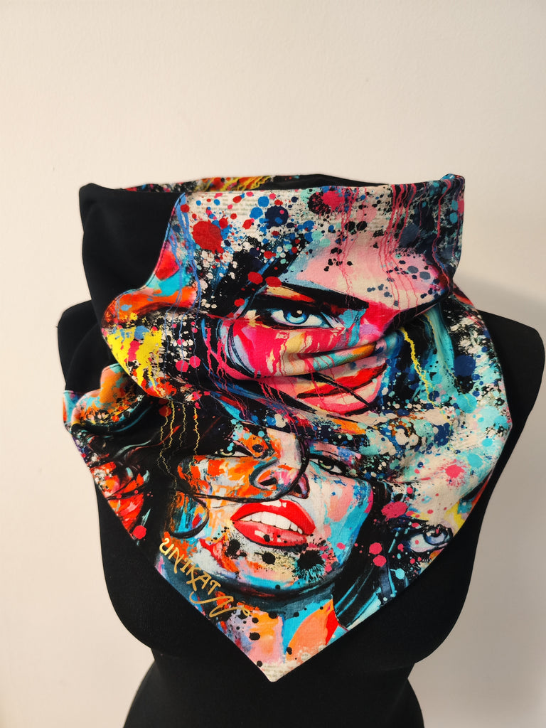 Cevasta rutica , ki jo enostavno nataknete čez glavo. Zgornji del je v pisanih barvah z motivom obrazov kombiniran s črno, spodnji je enobarven črn, tako da jo lahko nosite na obe strani. Vzorček na rutici lahko kombinirate povsod in paše na vsak stil oblačenja.