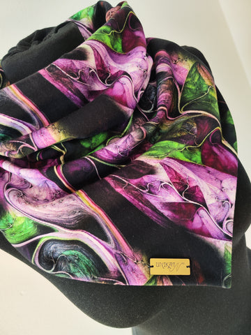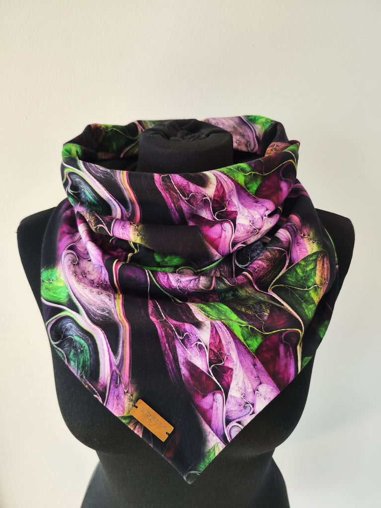 Rutica v cevasti obliki, ki jo preprosto nataknete čez glavo. Zgornji del v čudovitih odtenkih viola in zelena, spodnji del je črn.