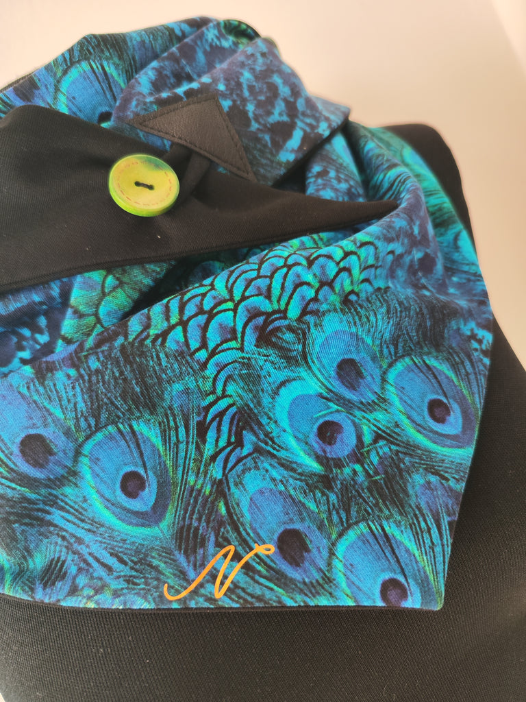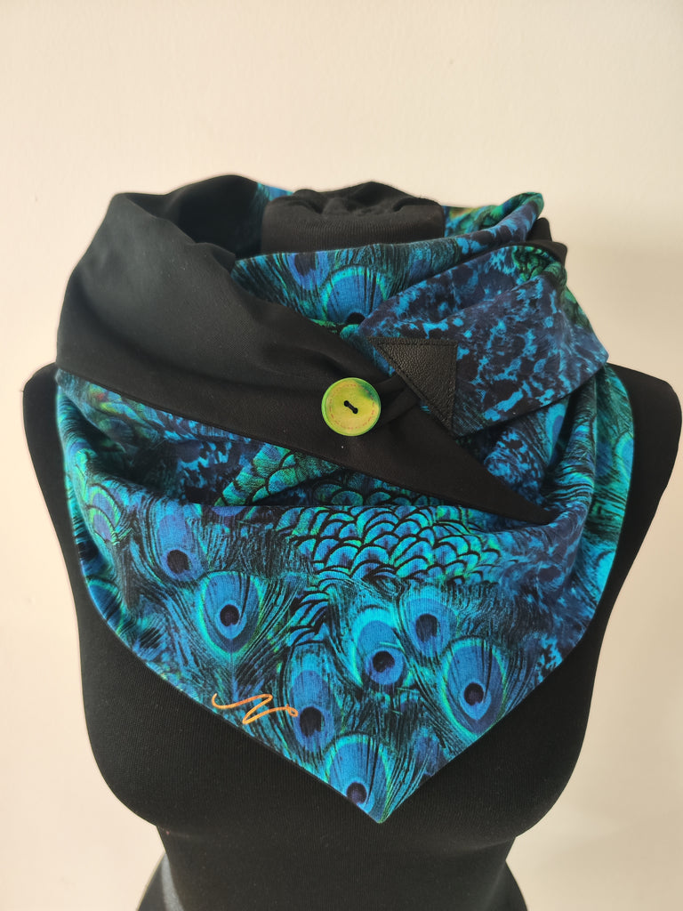 Unikatni šal v obliki rutice, ki ga spredaj zapnete na gumb. Zgornji del je v prečudovitih modro zelenih odtenkih z motivom pavjih peres, spodnji del je črn, tako da jo lahko nosite obojestransko, ali pa se malo poigrate in poudarite črno na pisani podlagi, tako da obrnete krake rutice. Šal rutica je lep kos garderobe, ki popestri vašo oblačilo. V hladnejših dneh vas greje, v toplejših  pa je lep modni dodatek .