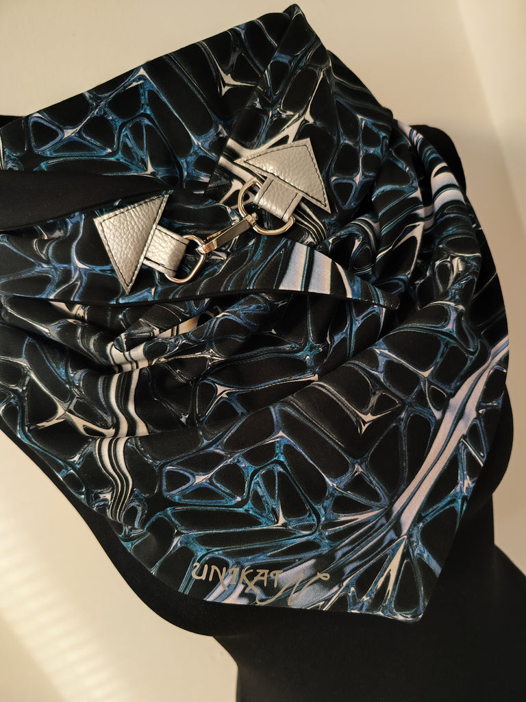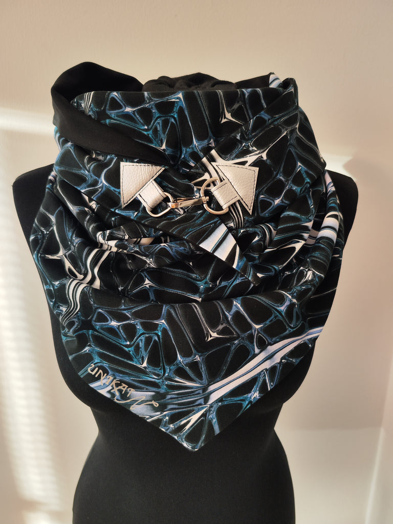 Unikatni šal v obliki rutice, ki ga spredaj zapnete na sponko. Na zgornjem delu je motiv mreže, spodnji del je črn, tako da jo lahko nosite obojestransko, ali pa se malo poigrate tako da obrnete krake rutice in je v zgornjem sprednjem delu več črne. Šal rutica je lep kos garderobe, ki popestri vašo oblačilo. V hladnejših dneh vas greje, v toplejših pa je lep modni dodatek .