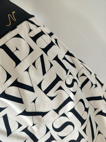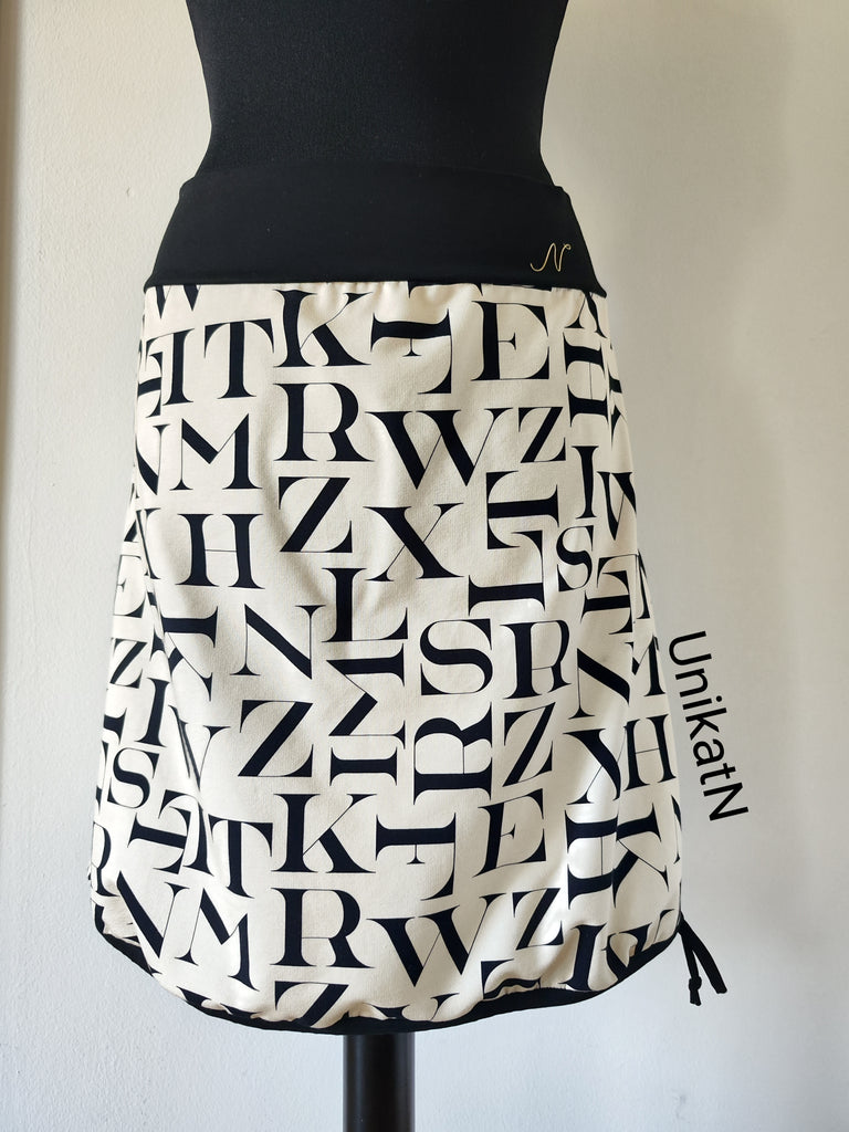 Modno unikatno krilo, ki ima spodaj funkcionalno vrvico, da ga lahko poljubno stisnete. Krilo je narejeno iz prijetnega elastičnega materiala, da se v njem res dobro počutite. Ta model je narejen v čudovitem vzorčku črk in je lepa popestritev vaše garderobe.