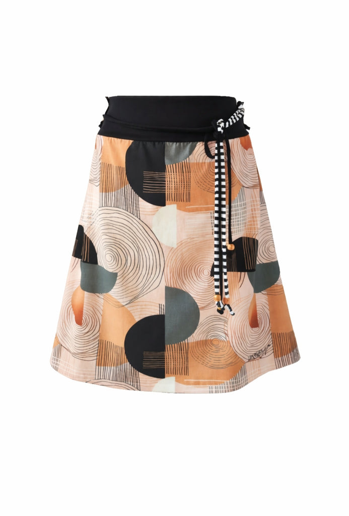Modno unikatno krilo, krojeno rahlo na A linijo. Krilo je narejeno iz tanjšega elastičnega materiala, da se v njem res dobro počutite. Vzorček na krilu je sestavljen iz krogov, polkrogov in črt, kar mu da prav poseben videz. Krilu je dodan tudi pasek za popestritev, ki pa ga lahko po potrebi tudi odstranite.