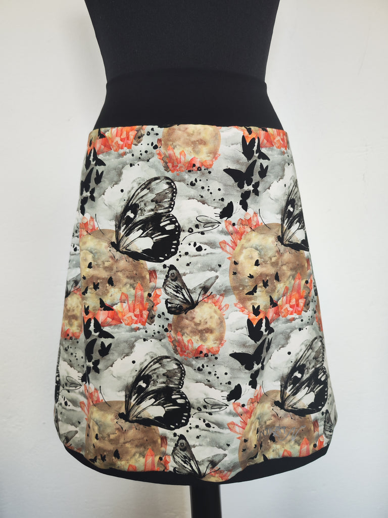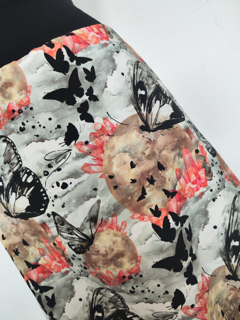 Modno unikatno krilo, narejeno iz prijetnega elastičnega materiala, da se v njem res dobro počutite. Krilo je krojeno na A linijo in spodaj rahlo stisnjeno s prišitim trakom. Ta model je narejen v čudovitih sivo bež odtenkih z motivom metuljčkov in je lepa popestritev vaše garderobe.