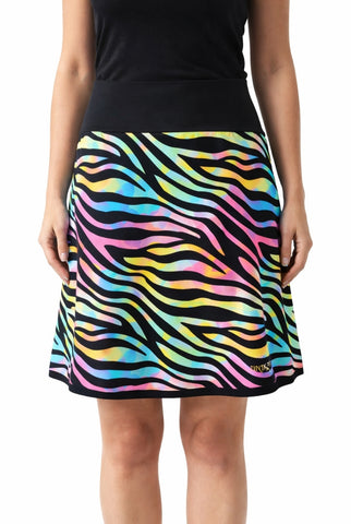 Modno unikatno krilo, narejeno iz prijetnega elastičnega materiala, da se v njem res dobro počutite. Krilo je krojeno na A linijo in spodaj rahlo stisnjeno s prišitim trakom. Ta model je narejen v čudovitih mavričnih barvah z motivom zebre in je lepa popestritev vaše garderobe.