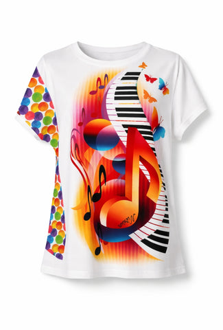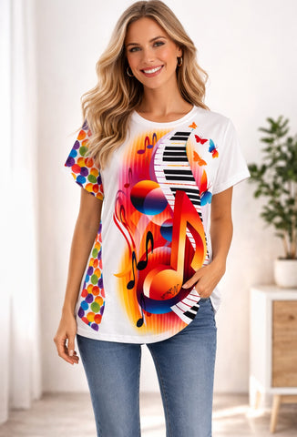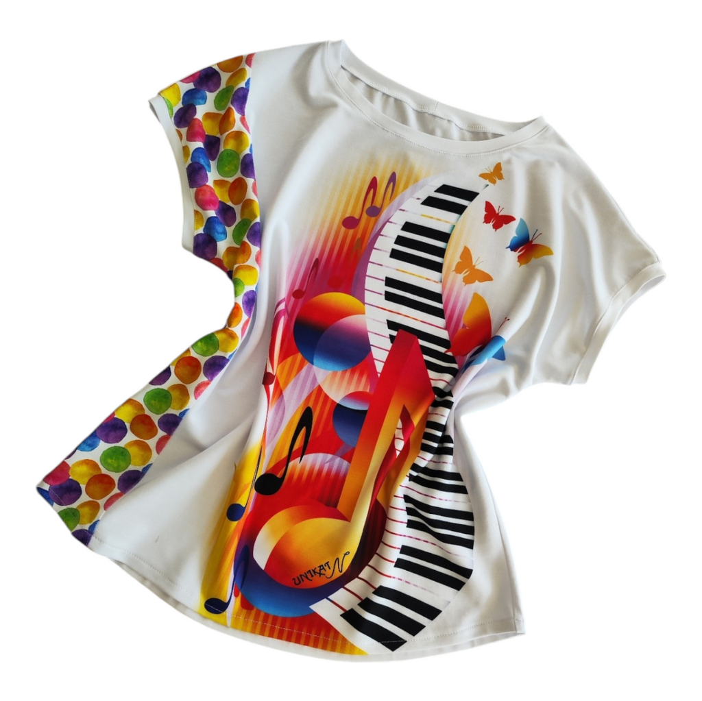 Unikatna udobna  majčka, s panelco mavrične glasbe, ki jo naredi prav posebno. Na strani ima vstavek iz mavričnega blaga s krogi, zadaj je enobarvna bela. Krojena v ravnem kroju, kar ji da udobnost in možnost nošenja v večih konfekcijskih številkah (glej mere). Tudi če pridobite ali izgubite kakšen kilogramček vam bo še vedno prav.