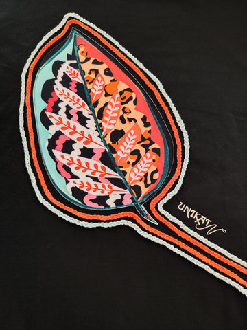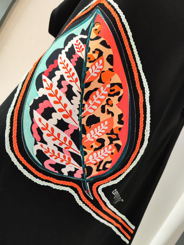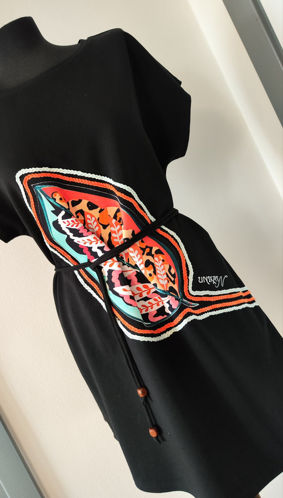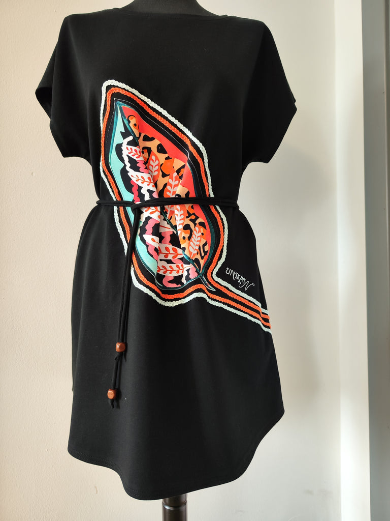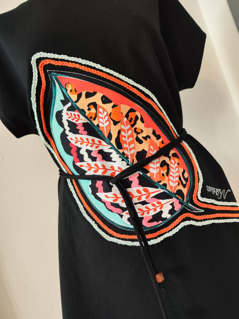 Unikatna udobna tunika, spredaj z aplikacijo lista, ki jo naredi prav posebno. Na sprednjem delu so detajli iz ročno kvačkane vrvice. V pasu je snemljiva vrvica, tako da si širino tunike lahko prilagajate. Krojena v ravnem kroju, kar ji da udobnost in možnost nošenja v večih konfekcijskih številkah. Tudi če pridobite ali izgubite kakšen kilogramček vam bo še vedno prav.